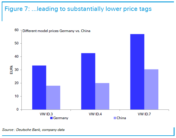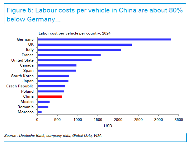 Ein wesentlicher Vorteil liegt in der Kostenstruktur. Nach Analyse der Deutschen Bank sind Arbeitskosten in China deutlich niedriger als in Deutschland, auch Energiepreise liegen unter europäischem Niveau. Hinzu kommen günstigere Beschaffungskosten für zentrale Komponenten von Elektrofahrzeugen, etwa Batterien, Leistungselektronik oder Infotainment-Systeme.
