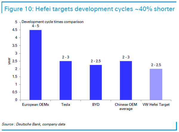 Mit dem neuen Zentrum in Hefei könnte Volkswagen genau das gelingen. Die Analysten gehen davon aus, dass lokale Entwicklung, parallele Testprozesse und direkte Einbindung chinesischer Zulieferer die Markteinführung neuer Modelle von bisher über vier Jahren in Deutschland, auf ungefähr zwei bis zweieinhalb Jahre in China.