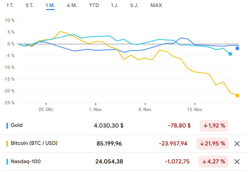 Wie befürchtet hielt die Freude über die Nvidia-Zahlen gestern nicht lang. Wieder gab es heftige Verluste an den Börsen, der VIX (siehe Grafik oben) zeigt die wachsende Unsicherheit und Nervosität. Kritisch ist die Lage vor allem bei den Kryptowährungen. Bitcoin steht jetzt deutlich unter der Marke von 90.000 Dollar. Das ist ein Sieben-Monats-Tief und ein Minus von 30 Prozent gegenüber dem Höchststand bei 126.000 Dollar. Krypto-Fans stellen gerade schmerzhaft fest, dass der Bitcoin noch weit davon entfernt ist, die selbe Stabilität in Zeiten von Unsicherheit zu bieten wie Gold. Gold hält sich weiterhin sehr gut.