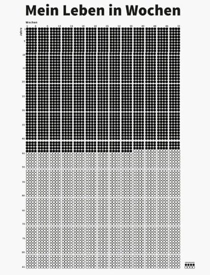 Ich bin vor Kurzem auf einen Lebenswochen-Kalender gestoßen. Vielleicht hast du dieses Poster auch schon einmal gesehen. Der Kalender stellt jede Lebenswoche als einen kleinen Kreis dar. Jede Reihe ist ein Jahr. Ich habe ihn ausgefüllt und musste erschrocken feststellen, dass fast die Hälfte des Bildes bereits mit schwarzen Punkten gefüllt ist. Wahrscheinlich ist es sogar mehr als die Hälfte – mal ganz davon abgesehen, dass schon morgen etwas passieren kann. Denn ehrlicherweise weiß ich nicht, was von den späten Lebensjahren zu erwarten ist. Die Chance ist groß, dass ich dann nicht mehr voll auf der Höhe bin, so bitter das auch ist.