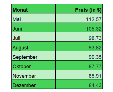 Die Öl-Futures gehen bisher nicht von so einem düsteren Szenario aus. Momentan ist eingepreist, dass der Ölpreis bis zum Sommer bei um die 100 Dollar steht. Ab August geht es aber runter in eine Spanne zwischen 80 und 90 Dollar bis zum Ende des Jahres.