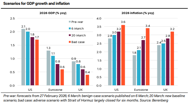 Die Berenberg-Bank hat angesichts der Eskalation ihre Konjunktur- und Inflationsprognosen erneut aktualisiert. In einer ersten Anpassung waren die Analysten noch davon ausgegangen, dass die Straße von Hormuz bis Ende März geschlossen bleibt und der Ölpreis bis September wieder auf ein altes Niveau fällt. Das neue Basisszenario ist nun, dass der Ölpreis bis April bei durchschnittlich 100 Dollar steht und dann bis November zurück auf 70 Dollar fällt. Entsprechend haben die Berenberg-Analysten ihre Konjunkturprognose gesenkt und ihre Inflationsprognose erhöht.