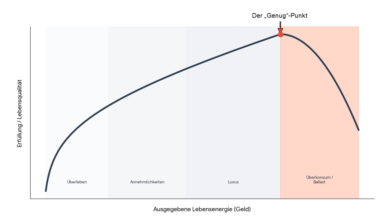 In den Phasen Überleben, Annehmlichkeiten und Luxus bringt uns jeder eingesetzte Euro einen echten Zuwachs an Lebensqualität (siehe Grafik). Ab dem Peak bedeutet mehr Besitz jedoch mehr Stress, mehr Sorgen und weniger Zeit für die Dinge, die wirklich zählen. Das "Mehr" wird zum Hindernis für die eigene Freiheit.